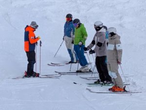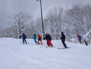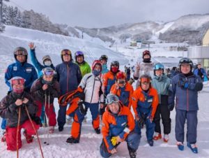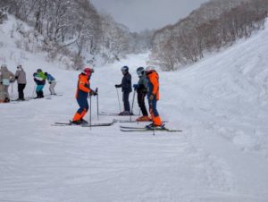村瀬会長と3人の講師、そして12名の受講者の計16名が参加しました。大島班・木村班・松下班の3班に分かれ、午前と午後、テーマ別にスキー技術の向上に取り組みました。昨日からの降雪と天候にも恵まれ、充実したレッスンになりました。